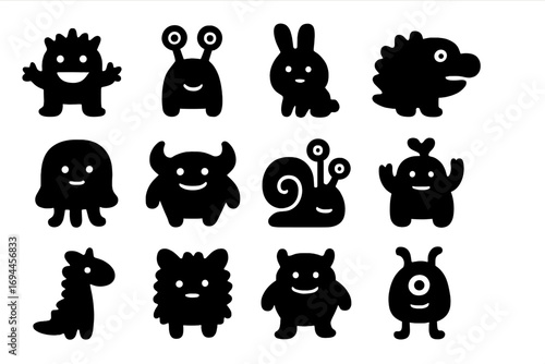 Collection of simple black silhouette icons featuring various cute and funny monster characters isolated on a white background
