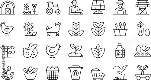Collection of simple line art icons representing various aspects of farming including a barn tractor solar panels chickens plants and eggs