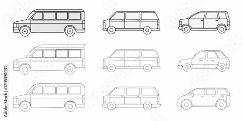 Collection of simple line art illustrations of various passenger vans and suvs in profile view
