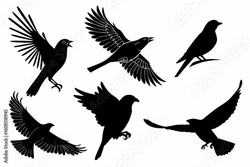 Collection of six black bird silhouettes in various flying poses