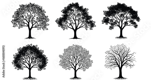 Collection of Six Deciduous Tree Silhouettes Showing Seasonal Changes, Black and White Vector Illustration for Nature, Landscape, and Environmental Design Projects