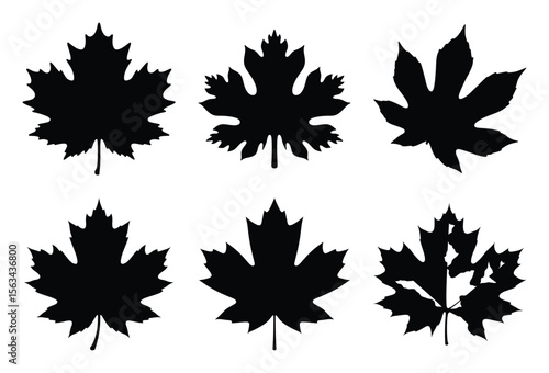 Collection of six diverse maple leaf silhouettes isolated on white background