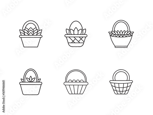 Collection of Six Unique Basket Outline Illustrations for Crafts Decoration and Easter Design Projects Seamless Black and White Vector Art