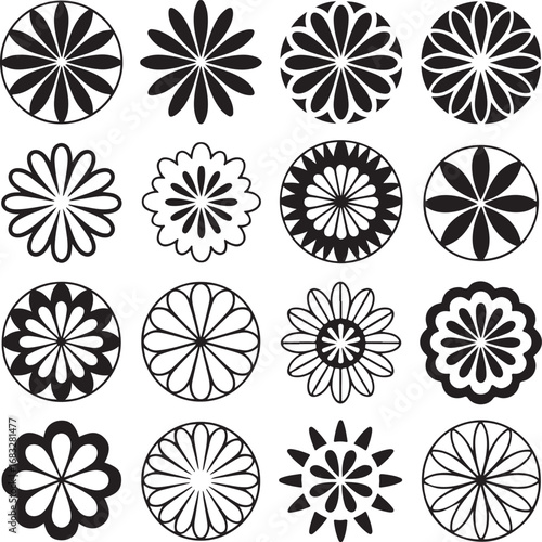 Collection of sixteen black and white floral geometric patterns on white graphic
