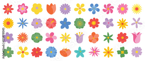 Collection of spring colorful flower elements vector. Set floral of wildflower, daisy, sunflower on white background. Hand drawn blossom illustration for decor, easter, sticker, clipart, print.