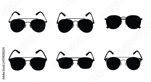 Collection of stylish sunglasses in various shapes and designs displayed in silhouette