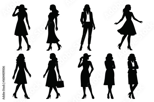 Collection of stylish women silhouettes. Set of female fashion models in elegant poses. Lady in dress and hat. Businesswoman in suit. Vector people isolated on white.