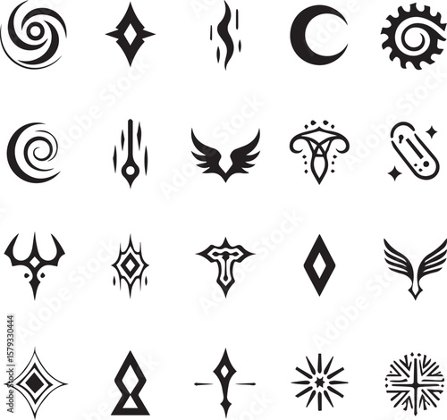 Collection of stylized black and white abstract symbols and icons representing various concepts like nature power and celestial bodies
