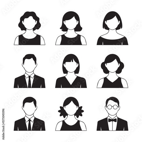 Collection of stylized black and white silhouette avatars representing diverse individuals with various hairstyles and formal attire for professional use