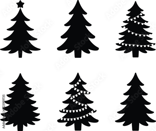 Collection of stylized black Christmas trees with festive lights and a star topper