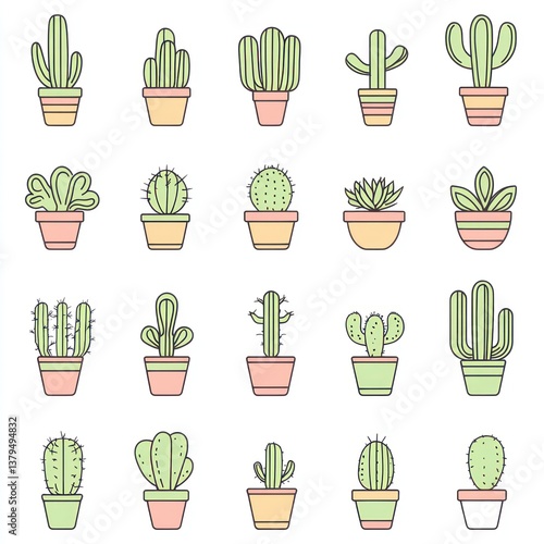 Collection of stylized cacti and succulents in their respective pots