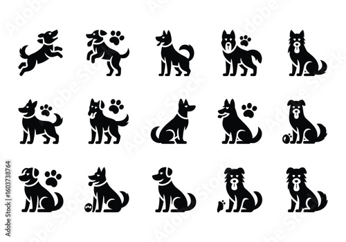 Collection of Stylized Dog Icons in Black Silhouette for Pet Related Designs and Canine Illustrations