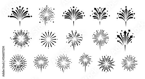 Collection of stylized fireworks shapes in black and white creates a festive display for celebrations or design accents, silhouette