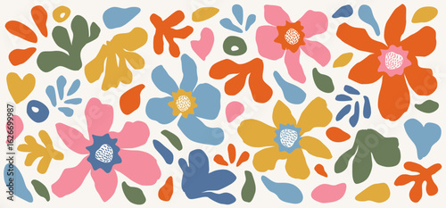 Collection of summer colorful flower elements vector. Set of cute flowers on white background. Hand drawn tropical floral vector for decor, poster, sticker, card, packaging, print and pattern.