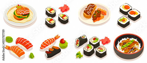 Collection of sushi and other Asian food, clean white background, colorful and appetizing