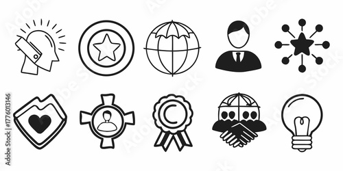 Collection of ten distinct black and white doodle style icons on a white background neatly arranged