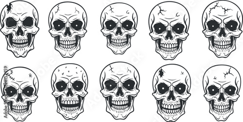 Collection of ten unique black and white skull vector illustrations for Halloween, Gothic designs, and graphic projects