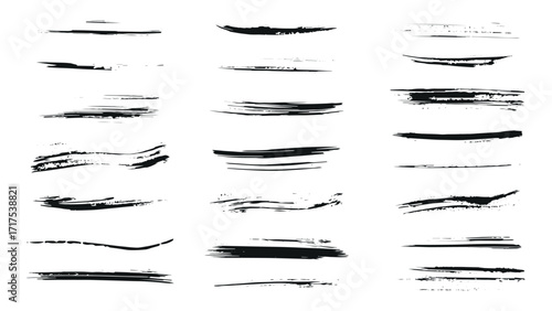 Collection of thin black stripes in grunge style on white background, uneven stripes drawn with thin dry brush, set of brush strokes drawn with ink by hand, grunge elements for decoration and design