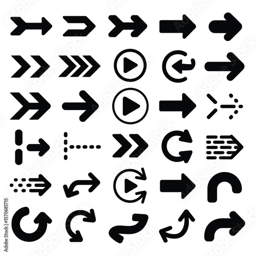 Collection of thirty black arrow icons various styles and directions including curved arrows right arrows left arrows double arrows and play symbols isolated on white background