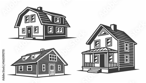 Collection of three distinct black and white vector illustrations of residential houses in a classic architectural style