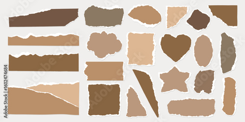 Collection of torn paper shapes in various shades of brown and beige. Includes rectangles, circles, and stars. Torn paper edges create a textured look. Brown element vector set.