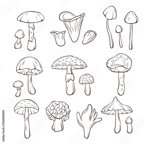Collection of toxic mushroom in line art style with fly agaric, angel wing and other. Perfect for coloring page, education poster and botanical theme on white background.