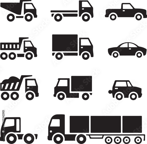 Collection of Transportation Vehicle Silhouettes Featuring Trucks and Cars for Logistics and Automotive Design Projects