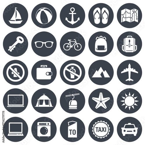 Collection of travel and vacation icons in a circular grid format