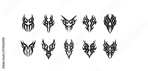 Collection of tribal tattoo designs showcasing various abstract shapes and patterns in black ink on a white background for body art and creative inspiration