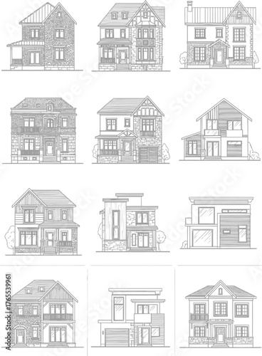 Collection of twelve detailed architectural line drawings of diverse residential house facades and elevations