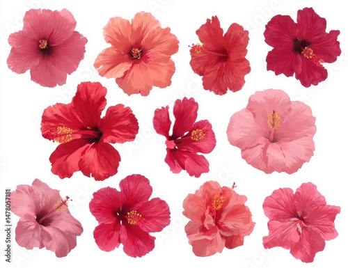 Collection of Twelve Hibiscus Flowers in Various Shades of Pink and Red