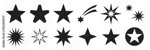 Collection of unique and varied star shapes in minimalist black and white for creative design purposes on transparent background