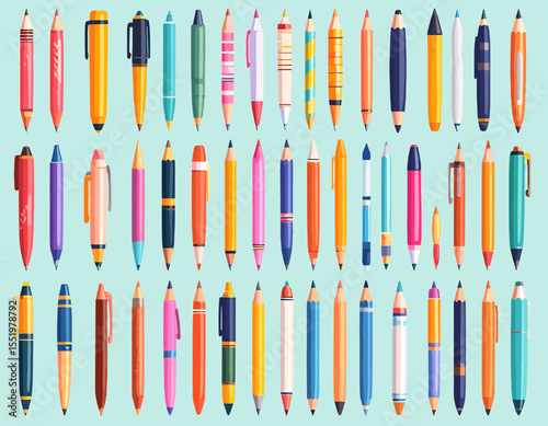 Collection of Various Colorful Pens and Pencils on Light Blue Background for Office School or Artistic Use