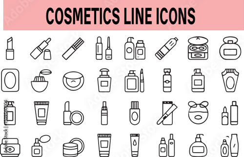 Collection of various cosmetic icons in modern linear outlined style for beauty and wellness.
