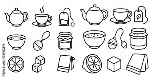 Collection of various food and drink items, including a teapot, cups, and bowls