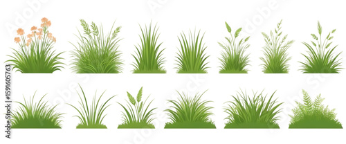 Collection of Various Green Grass and Plant Illustrations on Transparent Background for Design Projects