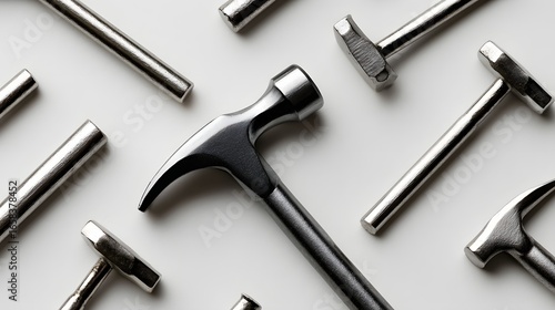 Collection of Various Metal Hammers and Tools Arranged Neatly on a White Background
