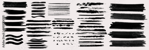 Collection of vector paint brush stroke, ink splatter, grunge line and artistic design elements. Dirty overlay, watercolor splash, black silhouette and torn paper set. Social media business banner art