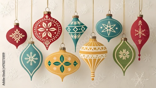 Collection of vintage inspired christmas ornaments with intricate patterns in red teal and yellow hanging against a white wood background