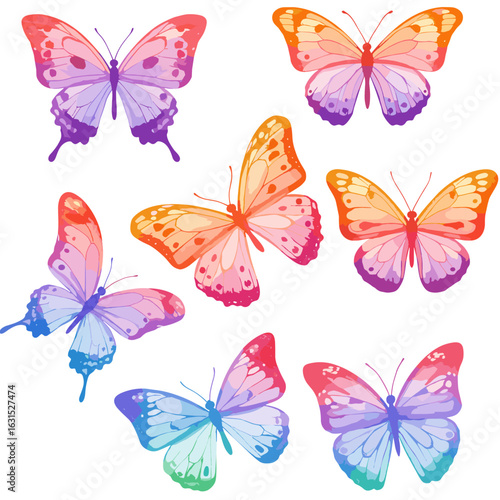 Collection of watercolor butterfly illustrations featuring vibrant, soft gradient colors and detailed wing patterns on a white background