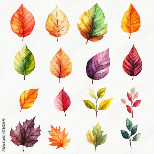 Collection of Watercolor Fall Leaves. Artistic Depictions of Autumn Foliage in Vibrant Hues
