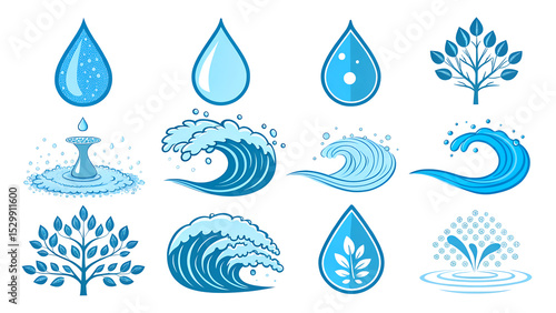 Collection of water-themed icons with droplets, waves, and spray elements.