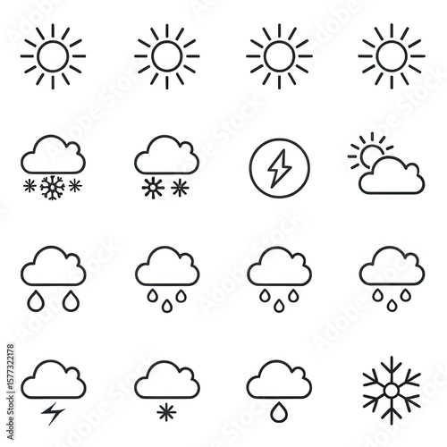 Collection of white line weather icons on a black background isolated on transparent background isolated on white background