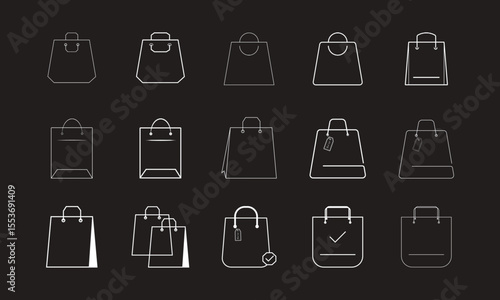 Collection of white shopping bag line art icons with different designs and features on a black background