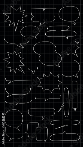 Collection of white speech bubbles on a black grid background. Speech bubbles vary in shape and size. Speech bubbles for comics and design. Message illustration vector.