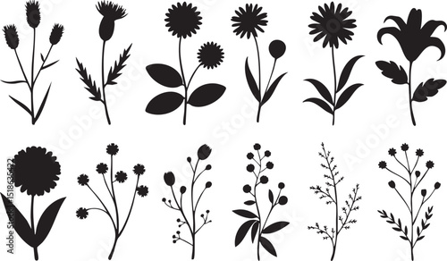 Collection of Wildflower Silhouettes A Botanical Assortment in Black and White Floral Vector Design silhouette This image showcases