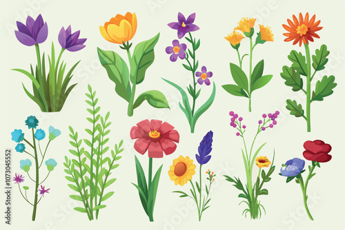 Collection of wildflowers, set, clipart, design game asset sprite sheet, aquarelle illustration, of hand drawn plants, leaves, flowers. Silhouettes of natural elements for seasonal backgrounds, and ve