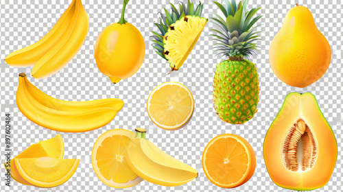 collection of yellow fruits, bananas, orange, pineapple
