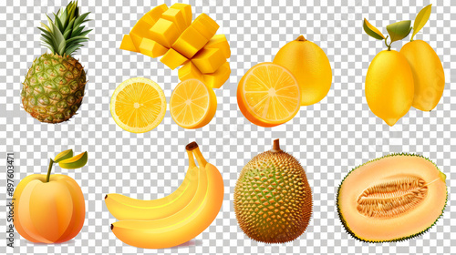 collection of yellow fruits, bananas, orange, pineapple