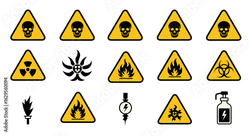 Collection of Yellow Warning Hazard Symbols on Black Background.